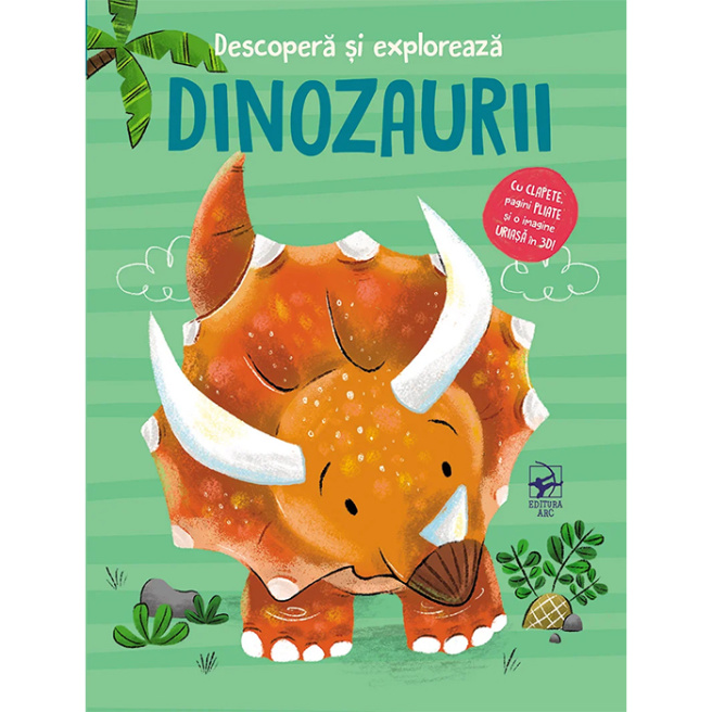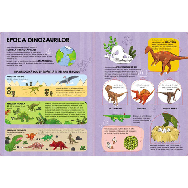 Călătorește în era mezozoică și fă prima ta descoperire minunată! Întoarce-te în timp, cu milioane și milioane de ani în urmă, și fă cunoștință cu dinozaurii de mult dispăruți, mari și mici: înoată printre plesiozauri, lasă-te uimit de creasta înaltă a pterodactililor, dar și de multe alte lucruri. Vezi textul și imaginile de sub clapete, precum și paginile pliate ale cărții pentru a afla diverse curiozități despre toate aceste animale. În afară de aceasta, vei găsi aici și imaginea în trei dimensiuni a celui mai mare dinozaur care a trăit vreodată pe Pământ! Lumea dinozaurilor e captivantă. Hai s-o explorăm împreună!