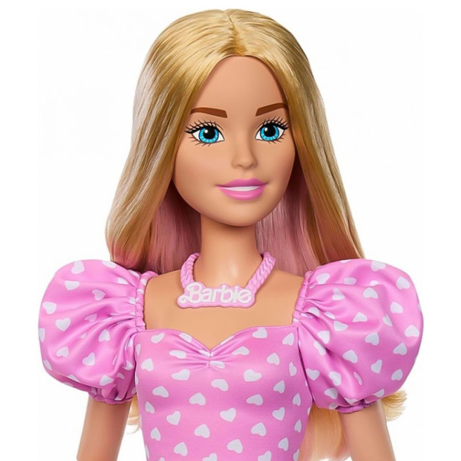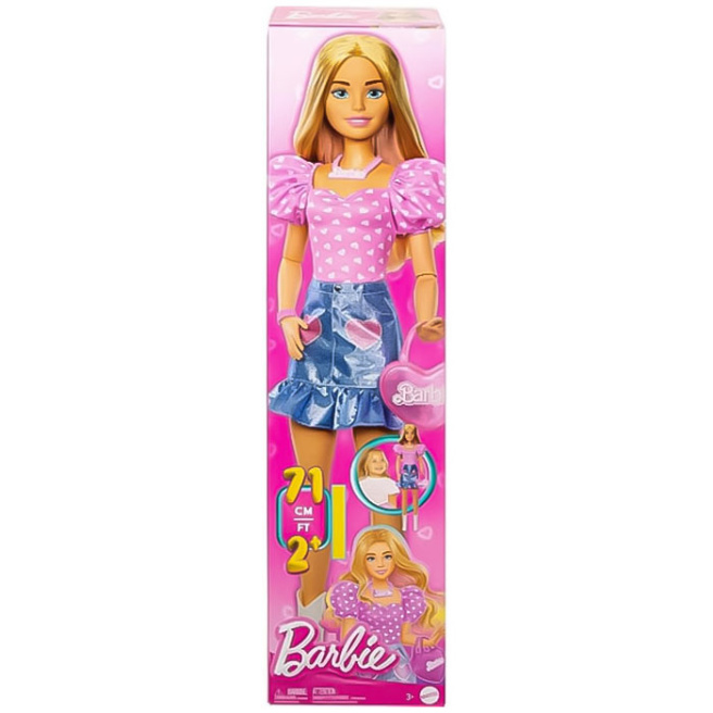 Este timpul să te joci cu Barbie! Barbie este îmbrăcată într-un top roz detașabil și o fustă din denim. Cizmele sale albe de cowboy completează colierul și poșeta lui Barbie. Părul ei lung blond cu accente roz poate fi aranjat în orice coafură. Cu această păpușă mare, imaginația poate juca o lume întreagă plină de posibilități de povestit! Păpușa nu poate sta singură.
