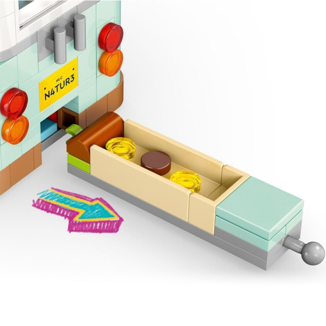 Acest set de joacă pentru copii are tot ce au nevoie tinerii exploratori pentru a-și spune propriile povești de camping. Prietenii stau în cabina șoferului și caută locul perfect în pădure. Dubița se deschide pentru a dezvălui o bucătărie cu echipament de gătit și o toaletă. Copiii vor râde cu siguranță când vor vedea cum dispar deșeurile atunci când toaleta "trage apa"! O scară duce la zona de dormit, unde există un pat pentru fiecare dintre cele 3 personaje mini-doll. Alte detalii includ o bicicletă pe care personajele să se plimbe, o masă de picnic cu scaune, un duș în aer liber și accesorii de camping, inclusiv o busolă, o cheie și un binoclu.