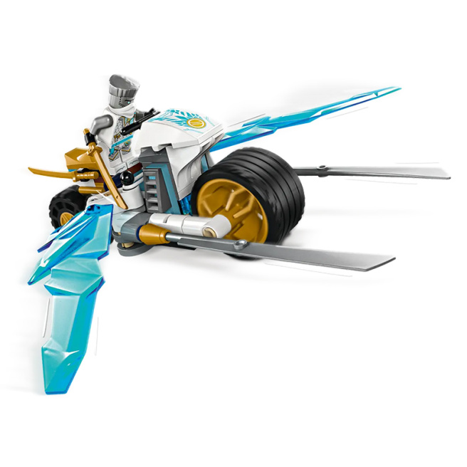 • Jucăria LEGO NINJAGO Zanes Ice Motorcycle permite băieților și fetelor cu vârsta de peste 7 ani să recreeze acțiunea rapidă din sezonul 2 al serialului TV NINJAGO Dragons Rising. Această jucărie ninja pentru copii include o motocicletă NINJAGO cu roți mobile, lame aurii și suspensie pe roata din spate. Atunci când copiii apasă pe anvelopă, lamele de gheață în mod de atac cool se deplasează pe ambele părți.