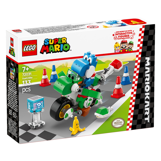 Setul LEGO Super Mario: Mario Kart - Yoshi Bike conține un model al motocicletei lui Yoshi realizat din cărămizi și, pentru prima dată într-un set LEGO Super Mario, o figurină Yoshi albastru deschis. Ajută-l pe Yoshi albastru deschis să-și conducă motocicleta între 4 conuri de trafic, să lanseze proiectile de pe motocicletă și să treacă de Banana.