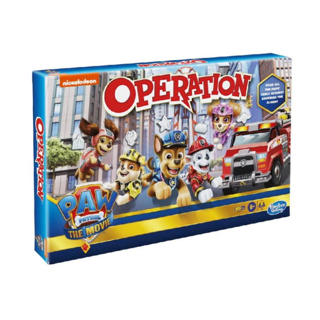 Jocul de societate Operation: Paw Patrol The Movie Edition este inspirat de scenele distractive și incitante din filmul Nickelodeon Paw Patrol. Jucătorii îi ajută pe pui să salveze ziua, dar trebuie să fie atenți la semnalul sonor!