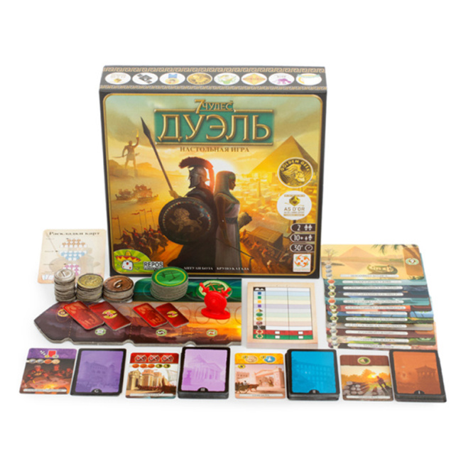• Dezvoltați știința și creați o armată de ne învins, ridicați clădiri magnifice și conduceți civilizația către victorie! 7 Wonders: Duel este un joc independent din seria populară 7 Wonders de jocuri de societate. În interior veți găsi un sistem complet nou de alegere a cărților, 3 modalități diferite de a câștiga, inclusiv superioritatea științifică și militară, precum și 12 minuni ale lumii, cu care fiecare joc ulterior va fi mai interesant decât cel precedent!