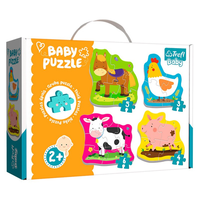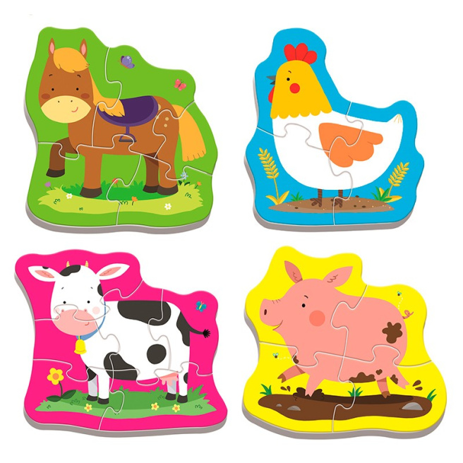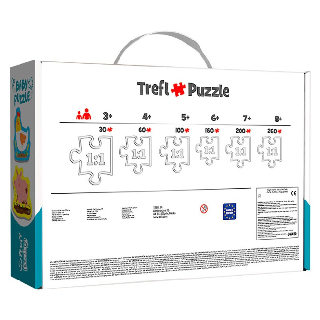 • Primele puzzle-uri pentru cei mai micuti din seria Baby Classic. Fiecare figura este formata din 2 puzzle-uri conturate, realizate din carton cu grosimea de 4 mm. Culorile expresive, designul simplu si dimensiunile mari ale puzzle-ului asigura o colectare usoara chiar si pentru cei mai micuti copilasi. Cu puzzle-urile Baby Classic, copiii dezvolta abilitatile manuale si isi extind cunostintele despre lumea din jurul lor.