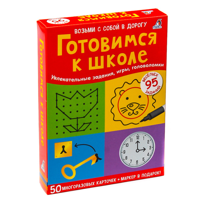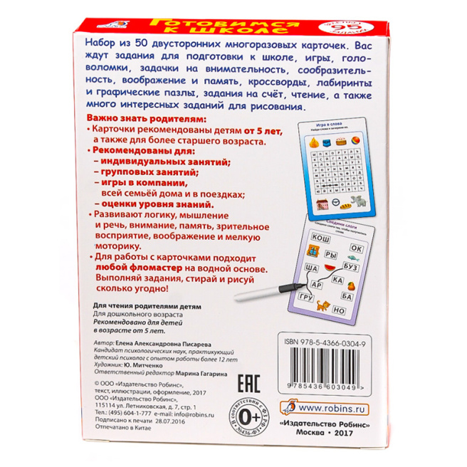 Вас ждут задания для подготовки к школе, игры, головоломки, задачки на внимательность, сообразительность, воображение и память, кроссворды, лабиринты и графические пазлы, задания на счет, чтение, а также много интересных заданий для рисования. Для работы с карточками подходит любой фломастер на водной основе. Выполняй задания, стирай и рисуй сколько угодно!