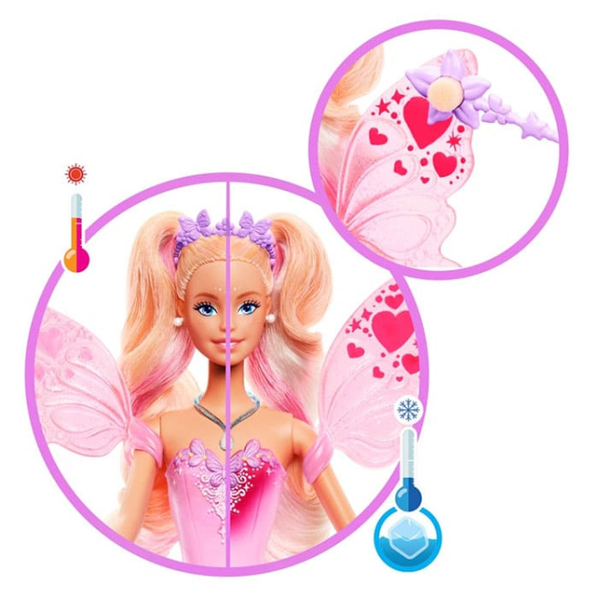 Создайте цветное волшебство с этой куклой-феей Barbie! Окуните губку ее звездной палочки в холодную воду, а затем проведите по ее крыльям, чтобы изменить цвет сердечек с розового на ослепительно красный! "Проведите палочкой по лифу куклы, чтобы получить восхитительное омбре. Смените воду на теплую, чтобы повторить цветовое волшебство. Кукла Barbie Fairy переливается в своем платье, туфлях на шпильке, ободке с бабочкой и ожерелье из капель воды - оставьте немного блеска везде, где только можно! Цвета и украшения могут варьироваться.