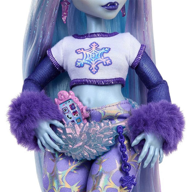 У куклы Эбби Боминабл длинные волосы пастельных оттенков и одета она в обрезанную футболку с сетчатыми рукавами и манжетами из искусственного меха. Ее брюки с принтом в виде снежинок имеют разрезы на подоле, а туфли на платформе - ледяной холод. Меховой шарф, сумка на поясе в виде сосульки, рюкзак в виде снежинки и матовые очки с подходящими серьгами придают ее облику неимоверно гламурные штрихи.