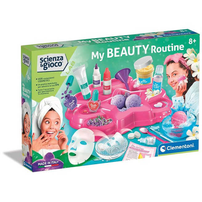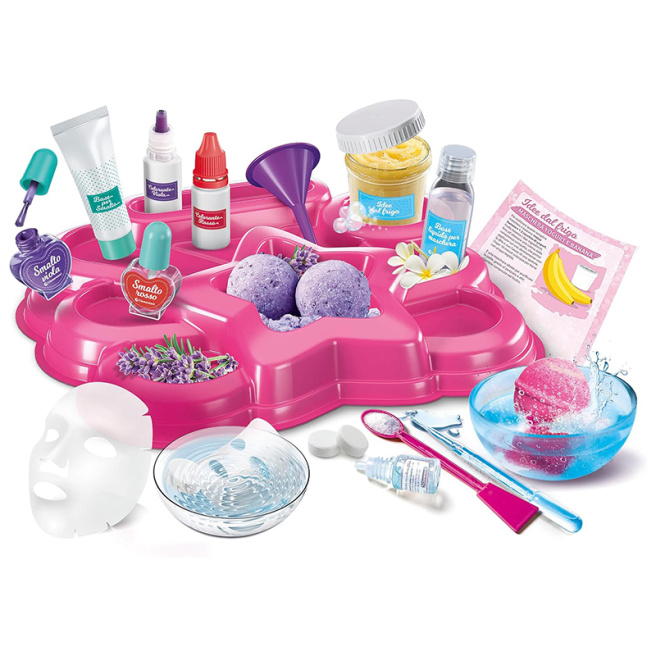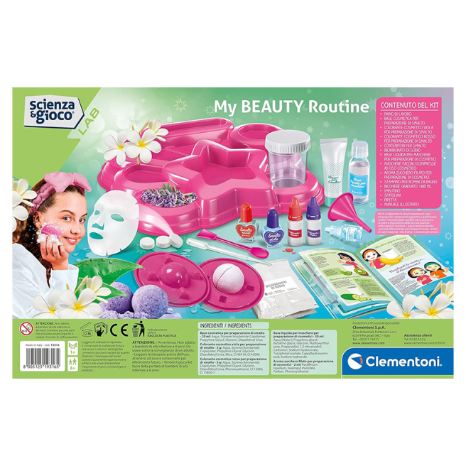 В набор Clementoni Science & Play входит все необходимое для ежедневного ухода за лицом. В наборе вы найдете различные аксессуары и кисти для красоты, формочки для мыла, маски для лица, тематические инструменты и бомбочки для ванны.
